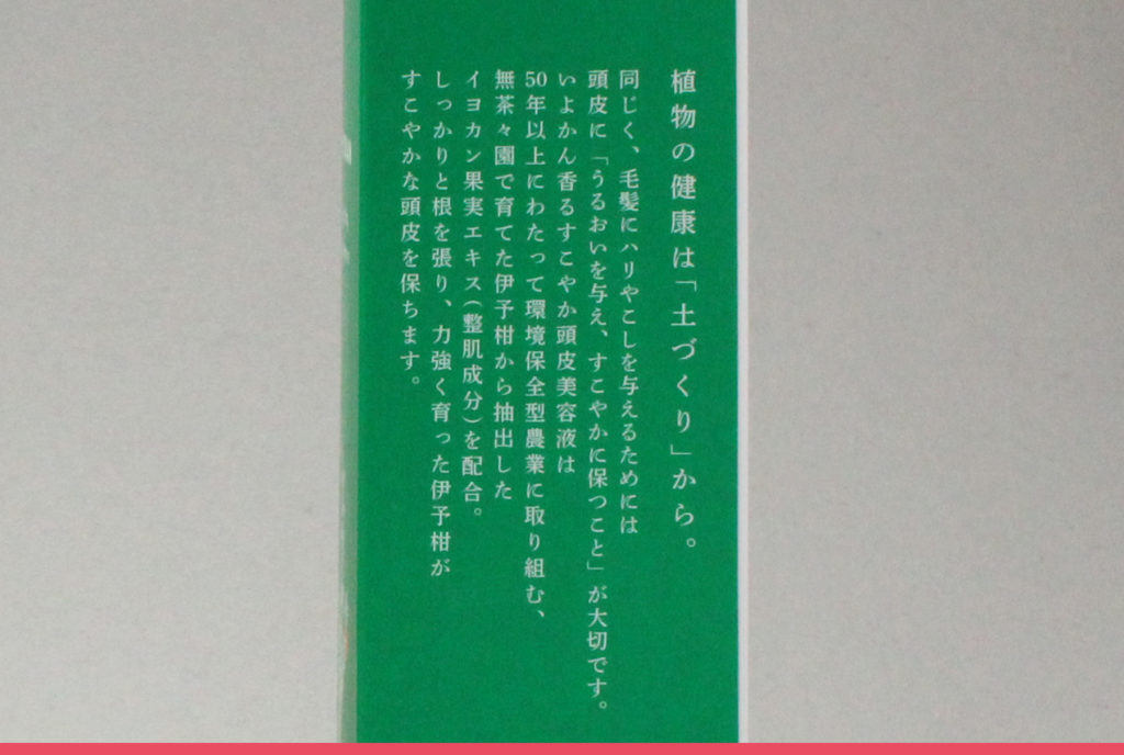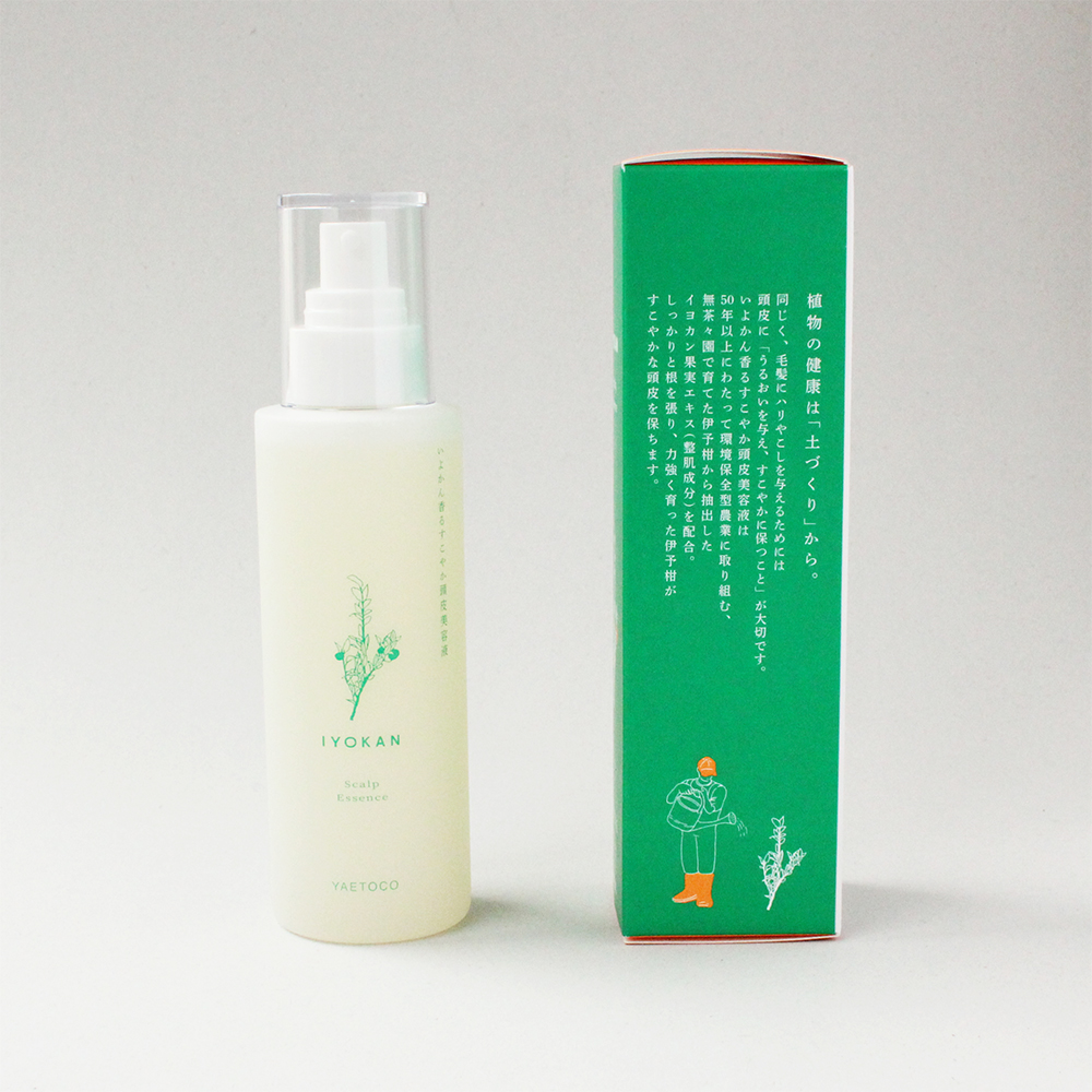 愛媛県の海と山がある穏やかな明浜という地域で、農薬をなるべく使わない農業と地域を構築している団体無茶々園さんの伊予柑を使用した頭皮ケアコスメ。できるだけ育てたものを余すことなく使うというコンセプトでコスメづくりにも励んでいる。伊予柑の幼い木に水をあたえて、ゆっくり育てる様子と頭皮ケアを重ねたパッケージデザイン。生命力と繊細さが伝わってくるようなパッケージを意識した。